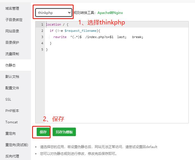 2、在左側(cè)找到【偽靜態(tài)】,然后選擇thinkphp保存即可,如下圖所示:
