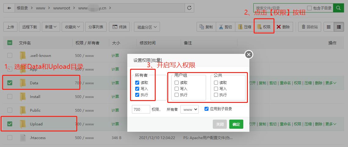 2、將Data和Upload目錄設(shè)置為可讀寫(xiě)權(quán)限,按下圖設(shè)置即可