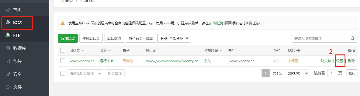 1、依次登錄【寶塔面板后臺(tái)】-【網(wǎng)站】,找到您需要配置的網(wǎng)站,點(diǎn)擊右側(cè)的【設(shè)置】