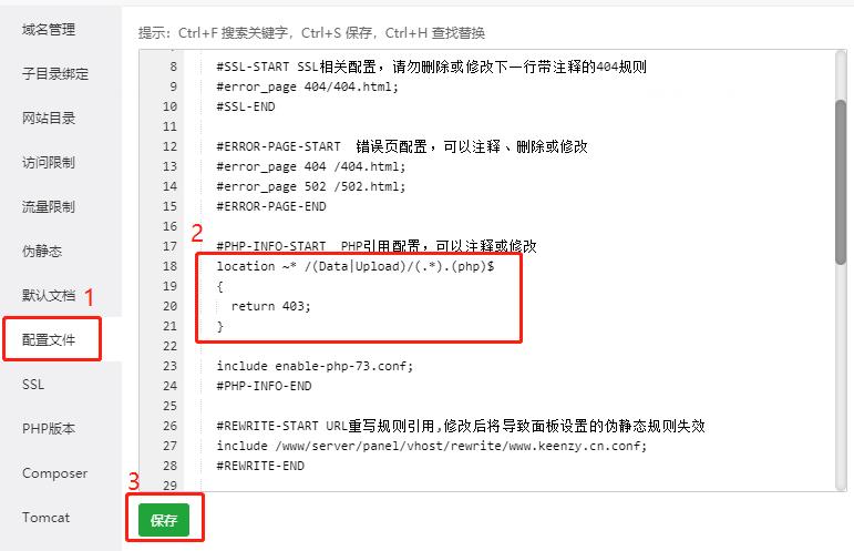2、在左側(cè)找到【配置文件】,搜索找到文本:#PHP-INFO-START PHP引用配置,可以注釋或修改,然后在它下面添加如下代碼: