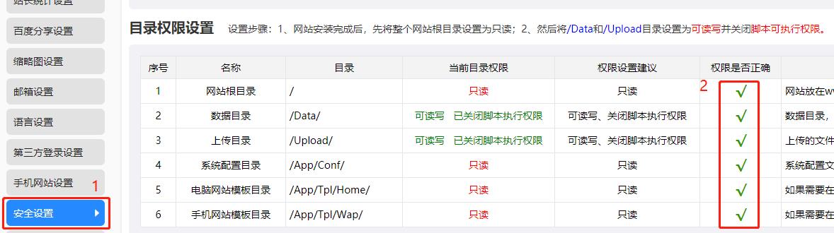4、登錄網(wǎng)站管理后臺(tái),依次進(jìn)入【設(shè)置】-【安全設(shè)置】,檢查一下目錄權(quán)限是否設(shè)置正確
