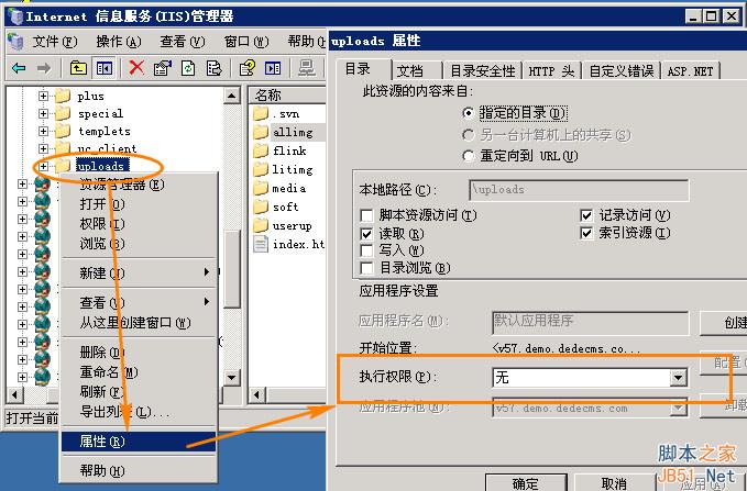 打開IIS中站點(diǎn),在站點(diǎn)Upload目錄點(diǎn)擊右鍵,菜單中選擇“屬性”,在目錄屬性面板選擇執(zhí)行權(quán)限為“無(wú)”即可。如下圖所示: