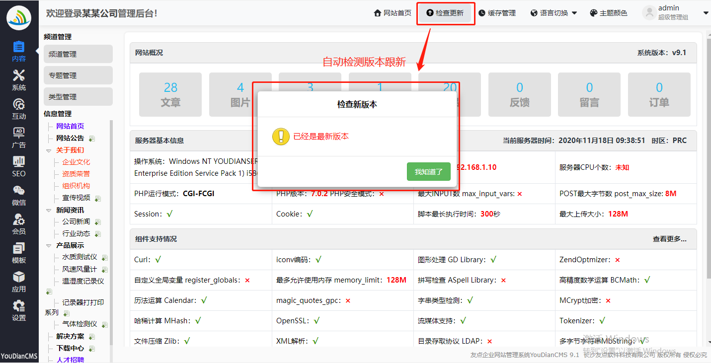 - 登錄后臺(tái)界面就可以看到頂部的【檢查更新】按鈕,可以檢查系統(tǒng)版本和在線升級(jí),如下圖右上角: