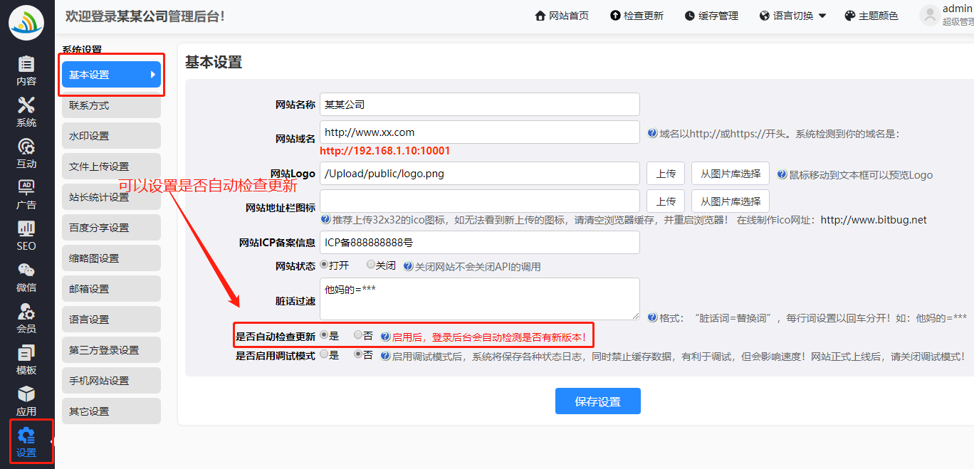 - 通過后臺(tái)【設(shè)置】——》【基本設(shè)置】可以開啟自動(dòng)檢查更新功能,如下圖: