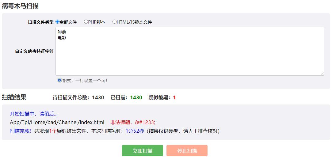 插件根據(jù)云端病毒特征碼+自定義病毒特征(選填)來檢測網(wǎng)站是否包含病毒木馬文件!