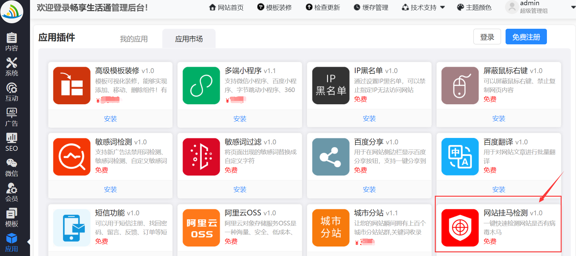 網(wǎng)站后臺——》應(yīng)用——》我的應(yīng)用——》找到“掛碼檢測插件”——》點(diǎn)擊安裝