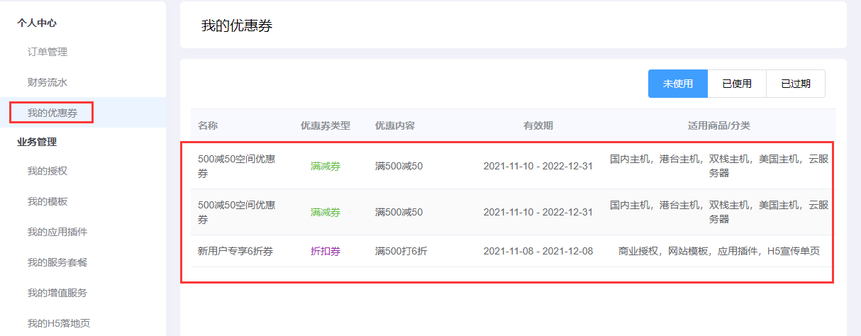 3、查看優(yōu)惠券:個(gè)人中心——》我的優(yōu)惠券里可以查看已擁有的優(yōu)惠券。