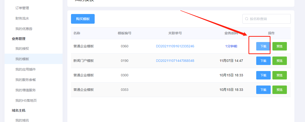 在線購(gòu)買的模板,可以自行下載網(wǎng)站模板,位置:用戶中心——》我的模板——》下載。